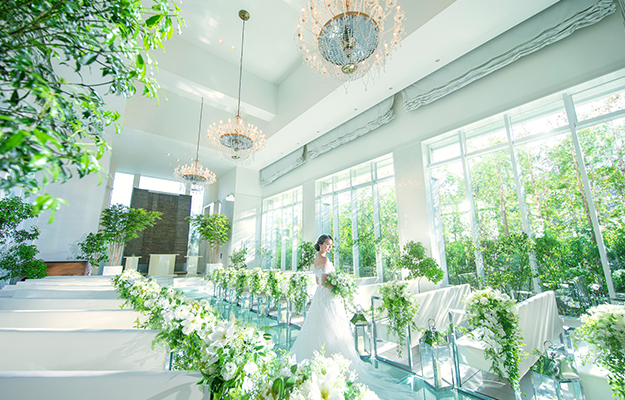 お二人の大切な一日が感動と幸せに包まれることをお約束する結婚式場。 ガーデンを望む大きな窓から陽が差し込む中でアットホームなパーティーを。